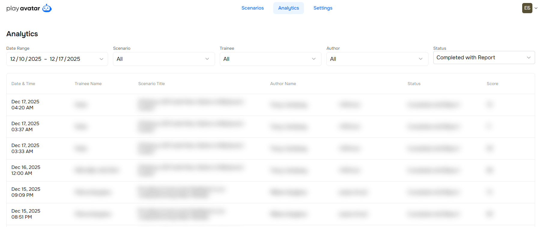 The "Analytics" section collects all results from completed roleplaying. Here, you can see which employees have completed which scenarios, their results, and when they did it. This helps quickly assess team progress and target training efforts precisely.