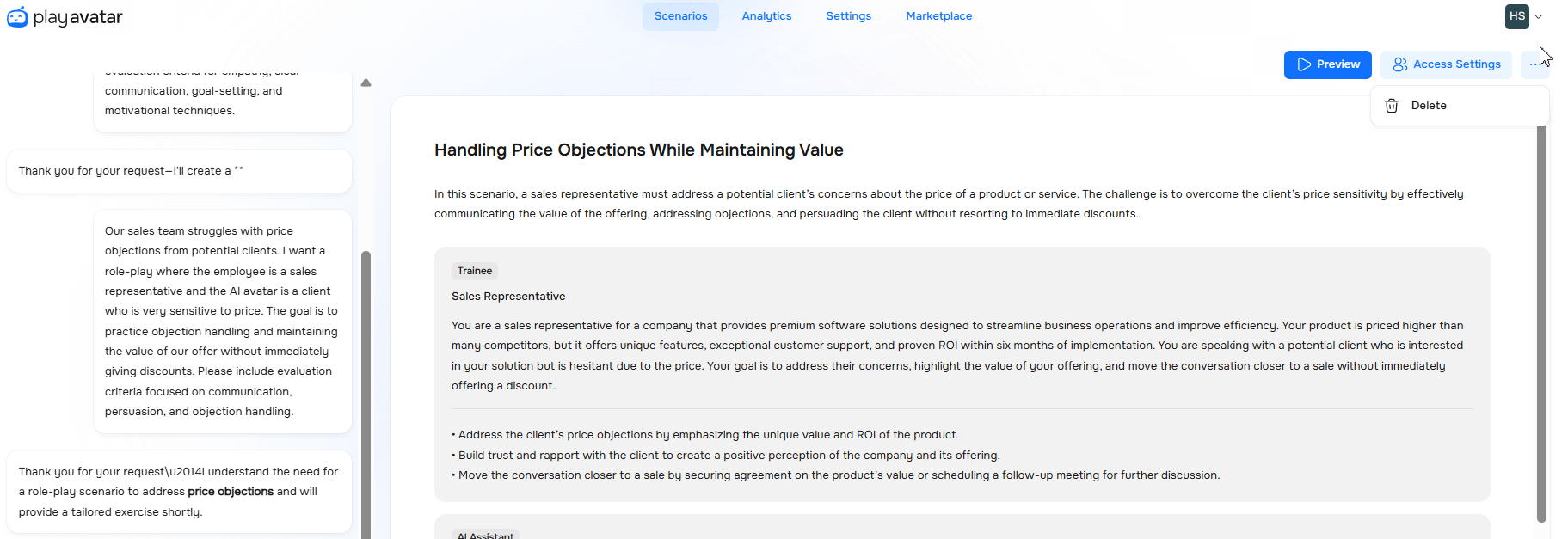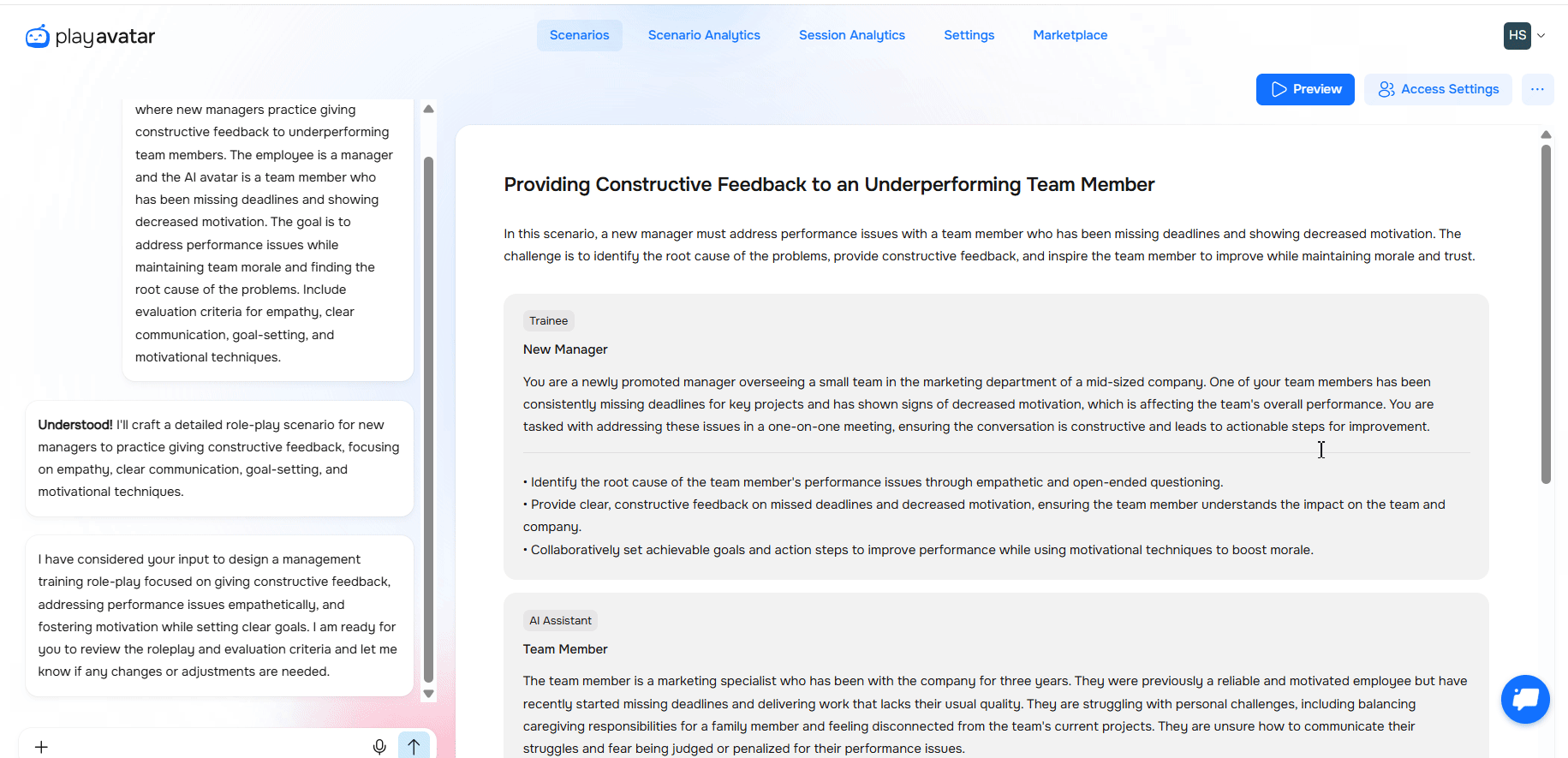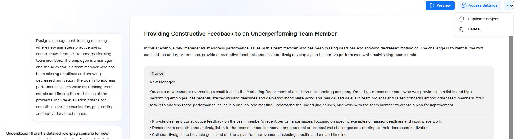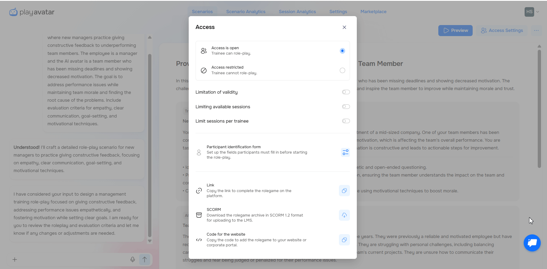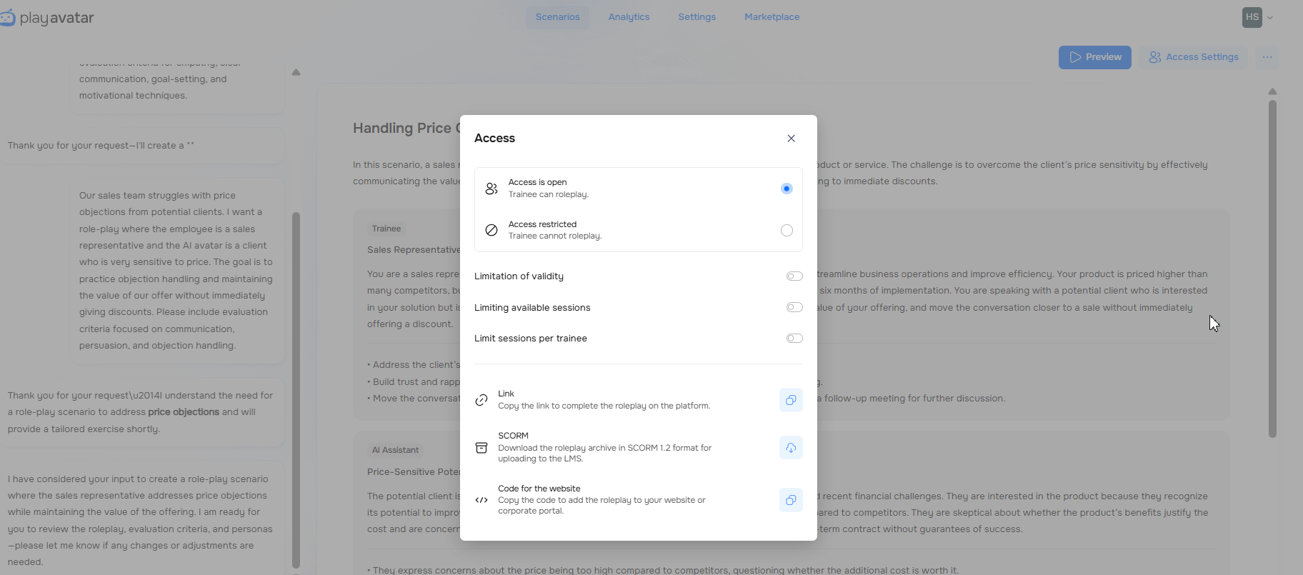 You have created a roleplay – now set up who can access it, when, and how. This will help you control the budget, timeline, and access for trainees. To do this, click the "Access Settings" button.
