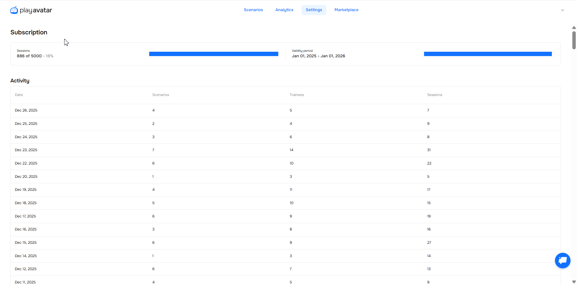 Activity is a table that shows your organization’s credit usage per day across all scenarios.