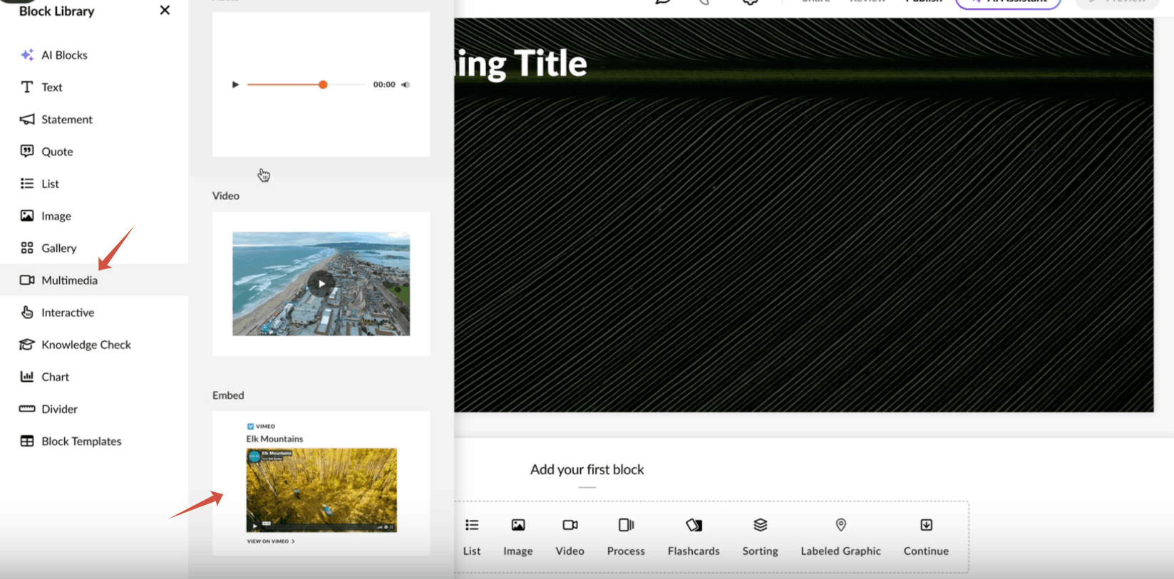 On your course slide, select or add a new content block. To do this, open the element library and select the” Multimedia” item, then select “Embed”.