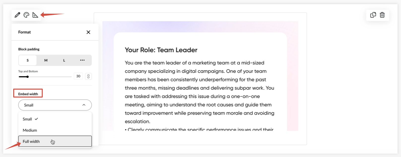 If you want to change how the roleplay is displayed in the builder, then click on format and select "Full width" in the "Embed width" field. This way, it will look exactly the same as on the PlayAvatar platform.