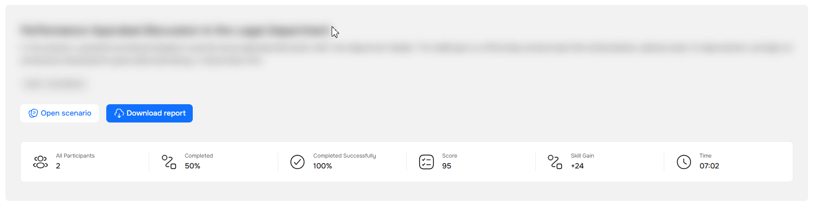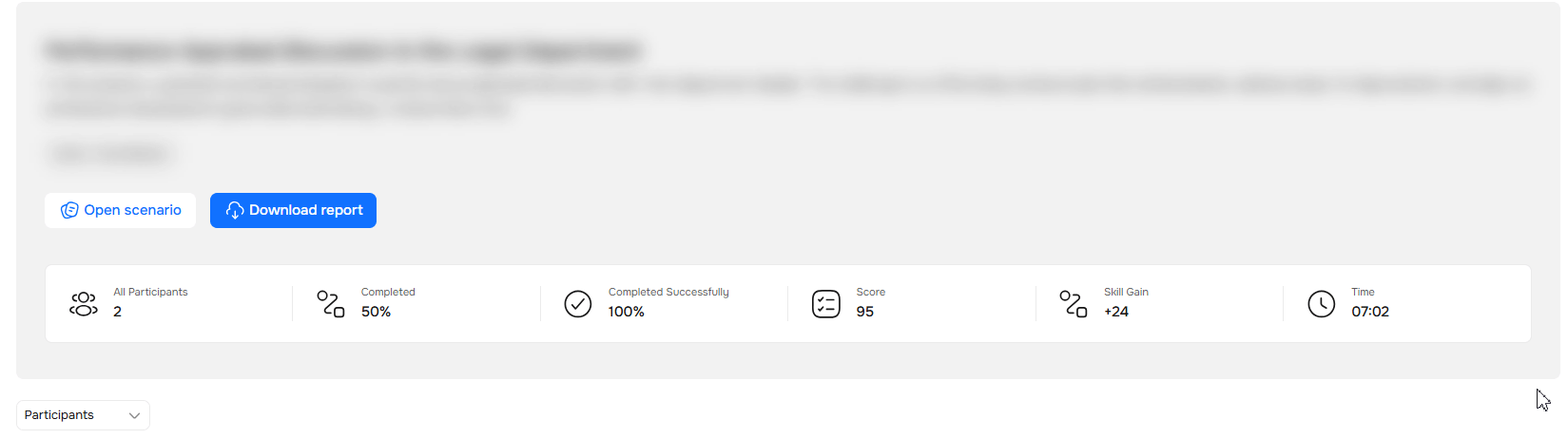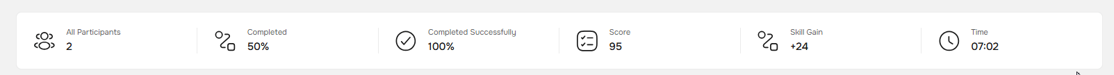 Skill Gain | How the participant's overall score across all scenarios is changing. An increase is indicated by a β, a decrease by a β. For example, if a participant scored 71 points previously and scores 95 this time, you'll see +24. |