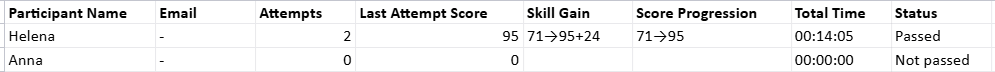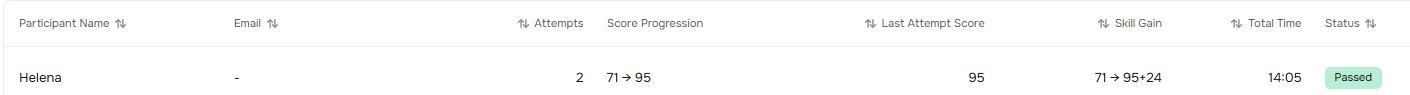 Score Progression | Shows how their score changed between attempts. If there's progress, you'll see an arrow and numbers, e.g., 71 → 95. If the score stayed the same, you'll see just one number, e.g., 71. If there's only one attempt, there's no progression, so you'll also see just one number (the score for that attempt). |
